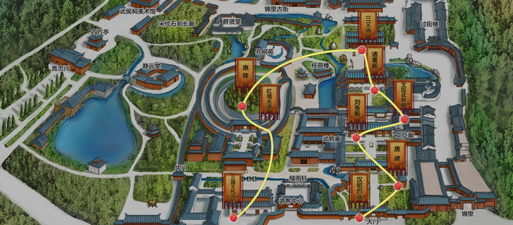 Zhuge Liang, whose courtesy name is Kongming, was born in 181 in Yangdu of Langya, as in present day Yinan of Shandong Province. In 207, Liu Bei secured an audience with Zhuge Liang after three visits deep in the mountains and triumphed in compelling Zhuge Liang to emerge from seclusion to his aid. In 208, Zhuge Liang was dispatched to the eastern state of Wu and succeeded in convincing Wu leader Sun Quan to form a Sun-Liu alliance, which set the stage for a tremendous victory against Cao Cao and the Wei army at the Battle of Chibi. After Liu Bei ascended to the throne as Emperor of Shu Han, Zhuge Liang was named chancellor. In 223, on his deathbed in Baidicheng, Liu Bei delegated Zhuge Liang as regent to support his only son Liu Shan. After the young Liu Shan succeeded the crown, Zhuge Liang was awarded the title Marquis of Wu, and concurrently held the offices of both Shu Han chancellor and the governor of Yi Province. In 225, Zhuge Liang personally led an army that crossed the torrential Jinsha River in May and pacified an uprising of ethnic minority groups in the south. Beginning from 227, Zhuge Liang initiated his grand conquest of the northern state of Cao Wei in an attempt to fulfill his former lord Liu Bei's dream of restoring the Han dynasty. Unfortunately, his body had expanded beyond its limits, and in 234 he died in his army camp at Wujiangyuan on his last northbound conquest at the age of 54 due to over-exhaustion. On either side of the Zhuge Liang statue are those of his son Zhuge Zhan and grandson Zhuge Shang.