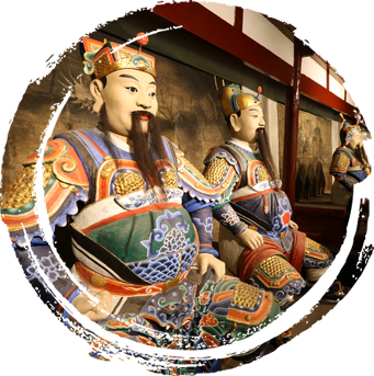 In the middle of the hall is a massive statue of a seated Liu Bei. The largest statue in the entire complex, the statue measures three meters in height and is gilt all over, and Liu is wearing a traditional emperor's crown and holding an imperial gui scepter. To Liu Bei's left and right are two servants, one holding an imperial jade seal and the other the shangfang baojian regal sword of state. On an altar in front of the statue is a plaque that reads Liu Bei's posthumous title "Emperor Zhaolie of Han," which fully exhibits the hierarchy and supremacy of the lord above his subjects. Liu has fought and endeavored over the majority of his lifetime but to no avail as he could not secure his own foothold anywhere. Having lost many battles and plunged into one abyss after another, he remained steadfast to his vision and eventually obtained the assistance of Zhuge Liang, cumulating in the establishment of the Shu Han regime. Yet, not long after the founding of Shu Han, suffering a series of military defeats on a conquest against the state of Wu, Liu Bei fell ill and ultimately succumbed to his sickness at Yong'an Palace in Baidicheng at the age of 63. To the two flanks of the main hall are the east side hall and west side hall, in the former of which is a statue of Liu Bei's brethren Guan Yu in the middle, along with those of Guan's sons Guan Ping and Guan Xing, as well as his lieutenants Zhao Lei and Zhou Cang; in the latter is a statue of Liu Bei's other brethren Zhang Fei in the center, accompanied by Zhang's son Zhang Bao and grandson Zhang Zun. Other than Zhou Cang being a fictitious personality created in the Romance of the Three Kingdoms, the others are all actual historical characters from the era. The spatial configuration and hierarchical placement of these three sets of statues illustrate the brotherhood between Liu Bei, Guan Yu and Zhang Fei, as well as their relationship as lord and subjects as depicted in the classic Romance of the Three Kingdoms.
