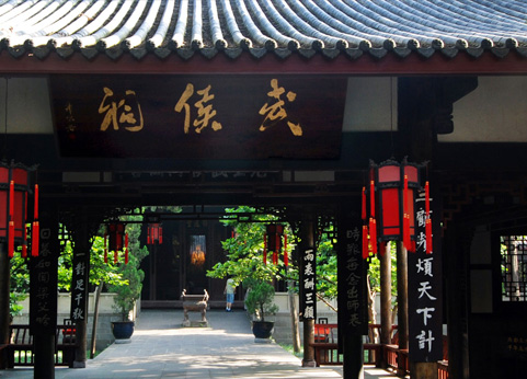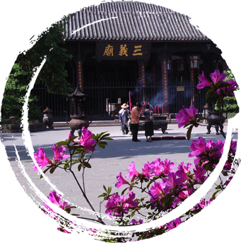 Located inside the Chengdu Wuhou Shrine complex, the Sanyi Temple was originally known as the Sanyi Memorial Hall and was constructed by Sichuan governor Zheng Jiaolin sometime during the early reign of Kangxi Emperor of Qing dynasty. During the 49th year of the reign of Qianlong Emperor of Qing (1784), the temple was destroyed in a fire started by burning incense and was rebuilt during the 52nd year of Qianlong Emperor's reign (1787), then subsequently renovated thoroughly during the 22nd year of the reign of Daoguang Emperor of Qing (1842). The structure and plaques seen today are all remains from the Daoguang period. Measuring 569 square meters in area, the temple was constructed with a mixed structure featuring five magnificent halls, but gradual decay has left just a modicum of the architecture still standing. In 1981 Sanyi Temple was announced as a Chengdu Municipal-level Cultural Relics Protection Unit, and in 1998, the complex was relocated from its original location on Tidu Street to inside the Wuhou Shrine complex. Inside the hall are statues of Liu Bei, Guan Yu and Zhang Fei, which were modeled after descriptions from the Romance of the Three Kingdoms and noted for their youth vigor and lively vim in their characterization. The figures are clad in plain-colored garments, which are indicative of their profiles after the trio formed their legendary brotherhood inside a peach blossom garden and began their new endeavor.