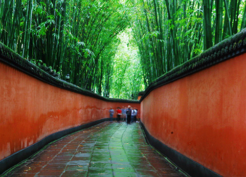 The Red Walled Alley curves around the two sides of the front gate to the Hui Mausoleum. Considered the most sentimental portion of the solemn Wuhou Shrine, the narrow slate path is lined by red walls and leads to the resting place of a wise lord that has slumbered for over 17 centuries. Beyond the red walls on either side of the passage are verdant bamboo forests, and the entire Red Walled alley is accentuated by this lush backdrop. A commercial shot by famous director Zhang Yimou was filmed on-spot here in 2003, thus exemplifying the alleyway's reputation as an ideal location for photography. Stroll along the path and say something aloud, you might hear your voice reverberating. While your words fade away, listen with your heart and soul and you might hear the walls whispering its stories to you. In such a place, even the coldest of hearts will surely be touched. This is the charm of the Red Walled Alley.